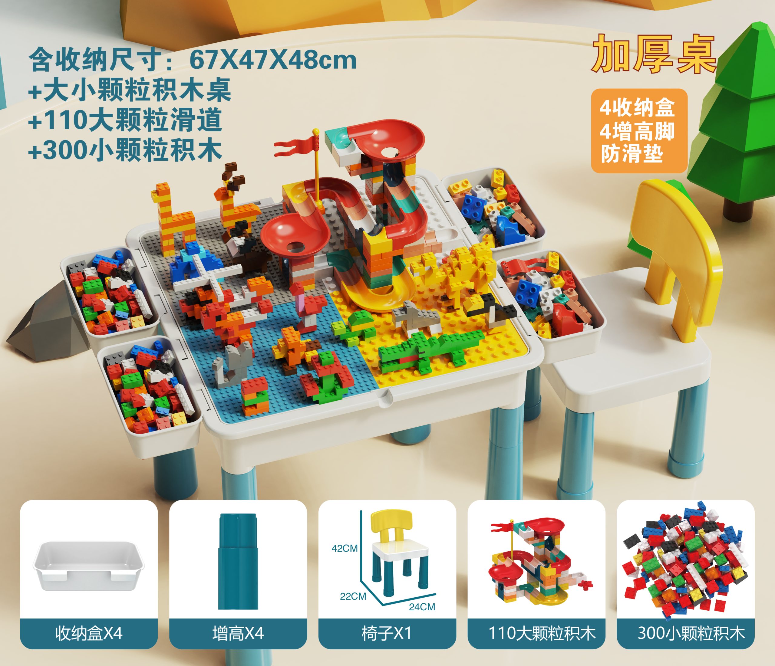 这款多功能积木桌旨在激发孩子的创造力和学习潜能,让他们沉浸在充满想象力的游戏、精细动作技能发展和有条理的乐趣中。宽敞的桌面可用于搭建积木、拼图或进行手工创作。它非常适合家庭、游戏室、教室或日托中心,是早期学习者和精力充沛的幼儿的必备之选。